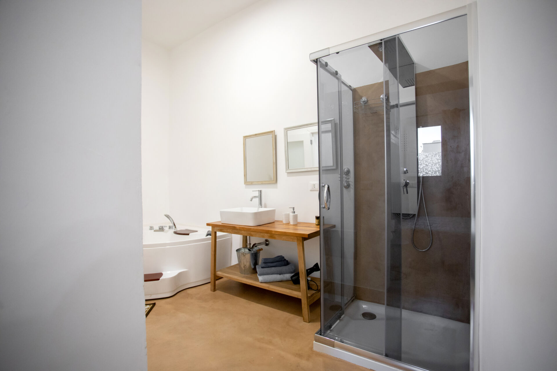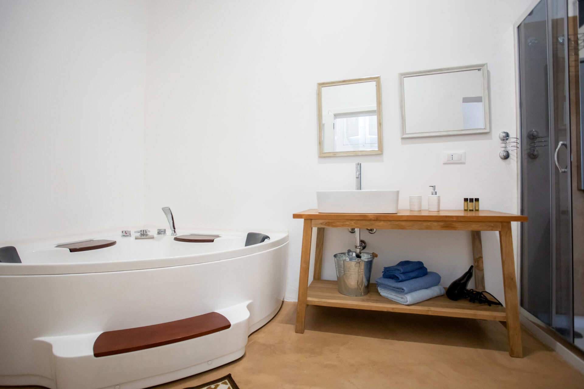Il bagno privato della Camera Graniglie è un vero e proprio angolo benessere, dotato di vasca con idromassaggio, doccia, asciugacapelli, bidet, set di cortesia e tutti i comfort per una pausa rigenerante.